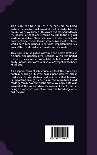 This work has been selected by scholars as being culturally important, and is part of the knowledge base of civilization as we know it. This work was reproduced from the original artifact, and remains as true to the original work as possible. Therefore, you will see the original copyright references, library stamps (as most of these works have been housed in our most important libraries around the world), and other notations in the work.This work is in the public domain in the United States of America, and possibly other nations. Within the United States, you may freely copy and distribute this work, as no entity (individual or corporate) has a copyright on the body of the work.As a reproduction of a historical artifact, this work may contain missing or blurred pages, poor pictures, errant marks, etc. Scholars believe, and we concur, that this work is important enough to be preserved, reproduced, and made generally available to the public. We appreciate your support of the preservation process, and thank you for being an important part of keeping this knowledge alive and relevant.