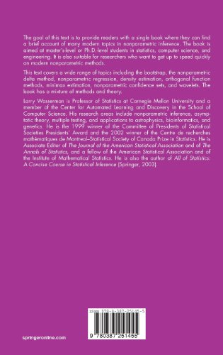 This text provides the reader with a single book where they can find accounts of a number of up-to-date issues in nonparametric inference. The book is aimed at Masters or PhD level students in statistics, computer science, and engineering. It is also suitable for researchers who want to get up to speed quickly on modern nonparametric methods. It covers a wide range of topics including the bootstrap, the nonparametric delta method, nonparametric regression, density estimation, orthogonal function methods, minimax estimation, nonparametric confidence sets, and wavelets. The book’s dual approach includes a mixture of methodology and theory.