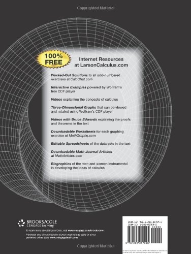 The Larson CALCULUS program has a long history of innovation in the calculus market. It has been widely praised by a generation of students and professors for its solid and effective pedagogy that addresses the needs of a broad range of teaching and learning styles and environments. Each title is just one component in a comprehensive calculus course program that carefully integrates and coordinates print, media, and technology products for successful teaching and learning.
