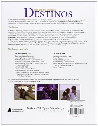 This video-based text for Beginning Spanish underscores McGraw-Hill’s reputation for developing groundbreaking language materials. Based on 26 hours of an engaging video drama that takes viewers around the Spanish-speaking world, Destinos is an effective program that can be used successfully in Spanish classes, as a college course for distant learners, and by individuals studying on their own.
