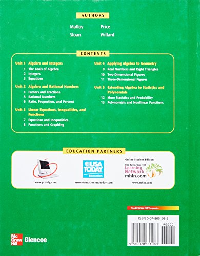 Glencoe Pre-Algebra is focused, organized, and easy to follow. The program shows your students how to read, write, and understand the unique language of mathematics, so that they are prepared for every type of problem-solving and assessment situation.