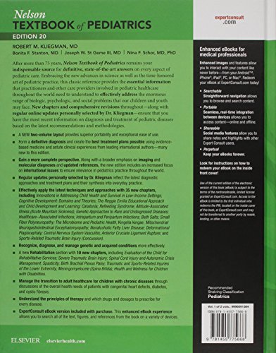 - Effectively apply the latest techniques and approaches with complete updates throughout 35 new chapters, including: Innovations in Addressing Child Health and Survival in Low Income Settings; Developmental Domains and Theories of Cognition; The Reggio Emilia Educational Approach Catatonia ; Refeeding Syndrome; Altitude-associated Illness; Genetic Approaches to Rare and Undiagnosed Diseases; Healthcare-Associated Infections; Intrapartum and Peripartum Infections; Bath salts and other drugs of abuse; Small Fiber Polyneuropathy; Microbiome; Kingella kingae; Mitochondrial Neurogastrointestinal Encephalomyopathy; Nonalcoholic Fatty Liver Disease; Plagiocephaly; CNS Vasculitis; Anterior Cruciate Ligament Rupture; and Sports-Related Traumatic Brain Injury.