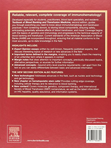 - New content has been added on molecular genetics, component therapy, and International Society of Blood Transfusion (ISBT) nomenclature, as well as the latest information on HIV, hepatitis, quality assurance, and information systems.