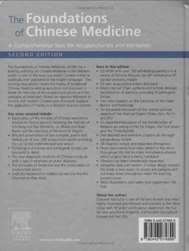 This successful Chinese medicine textbook covers the theory of traditional Chinese medicine and acupuncture, and discusses in detail the use of acupuncture points and the principles of treatment. The material is based on rigorous reference to ancient and modern Chinese texts, and explains the application of theory in a Western practice context. The new edition features new and updated material, including discussion of 50 additional acupuncture points and more patterns. A redesigned layout complements the accessible writing style and makes the material even easier to follow. Plus, an accompanying CD-ROM contains over 750 self-testing questions in a variety of formats.