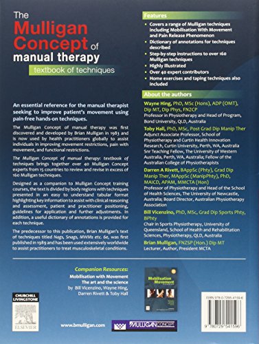 Designed as a companion to Mulligan Concept training courses, the text is divided by:Body regions with techniques highlighting key information to assist with clinical reasoning and assessment Patient and practitioner positioning, guidelines for application and further adjustments.