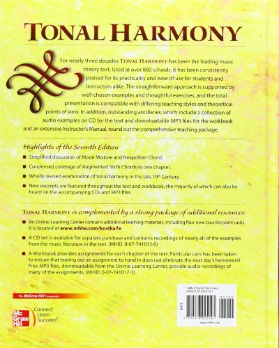 For over two decades Tonal Harmony has been the leading text for the two-year theory curriculum for music majors. Used at nearly 800 schools, Tonal Harmony has been consistently praised for its practicality and ease of use for student and instructor alike. The straightforward approach is supported by well-chosen examples and thoughtful exercises, and the total presentation is compatible with differing teaching styles and theoretical points of view. In addition, students can purchase a CD of recorded examples for use with the textbook, while audio examples for the workbook are available for download as MP3 files. For instructors, an extensive Instructor's Manual is available and rounds out this comprehensive teaching package.