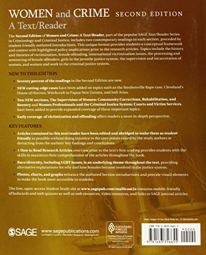 The Second Edition of Women and Crime: A Text/Reader, part of the text/reader series in criminology and criminal justice, incorporates contemporary readings (including some policy implications) accompanied by student-friendly authored text. This unique format provides a theoretical framework and context for students. The text includes the history and theories of victimization, female offending, international victimization issues, the processing and sentencing of female offenders, girls in the juvenile justice system, the supervision and incarceration of women, women and work in the criminal justice system. The text also includes cutting edge case studies of women in the criminal justice system on issues such as the Steubenville Rape case, Cleveland's House of Horrors, Witchcraft in Papua New Guinea and Jodi Arias.